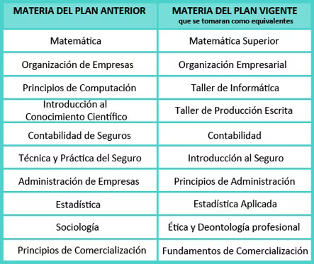 Asignatura Reaseguros, dado que en el plan de estudios figura sólo la materia Introducción al seguro como su inmediata anterior, se analiza, evalúa y decide agregar las materias, TÉCNICAS ESPECIALES II-AUTOMOTORES, TÉCNICAS ESPECIALES III-INCENDIO y LEGISLACIÓN DE SEGUROS que aportarán los conocimientos necesarios para garantizar el buen aprendizaje de la materia.
